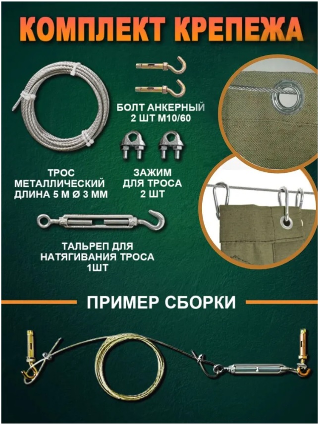 С этим комплектом вы получаете качественные крепежные элементы, которые гарантируют надежность и долговечность вашей шторе. Брезентовая штора с люверсами надежно закрепится с помощью зажимов, анкеров, тальрепа, которые также включены в комплект. В итоге, вы получите идеально подобранный набор крепежа для вашей шторы, который обеспечит ее стабильность и безопасность при использовании.